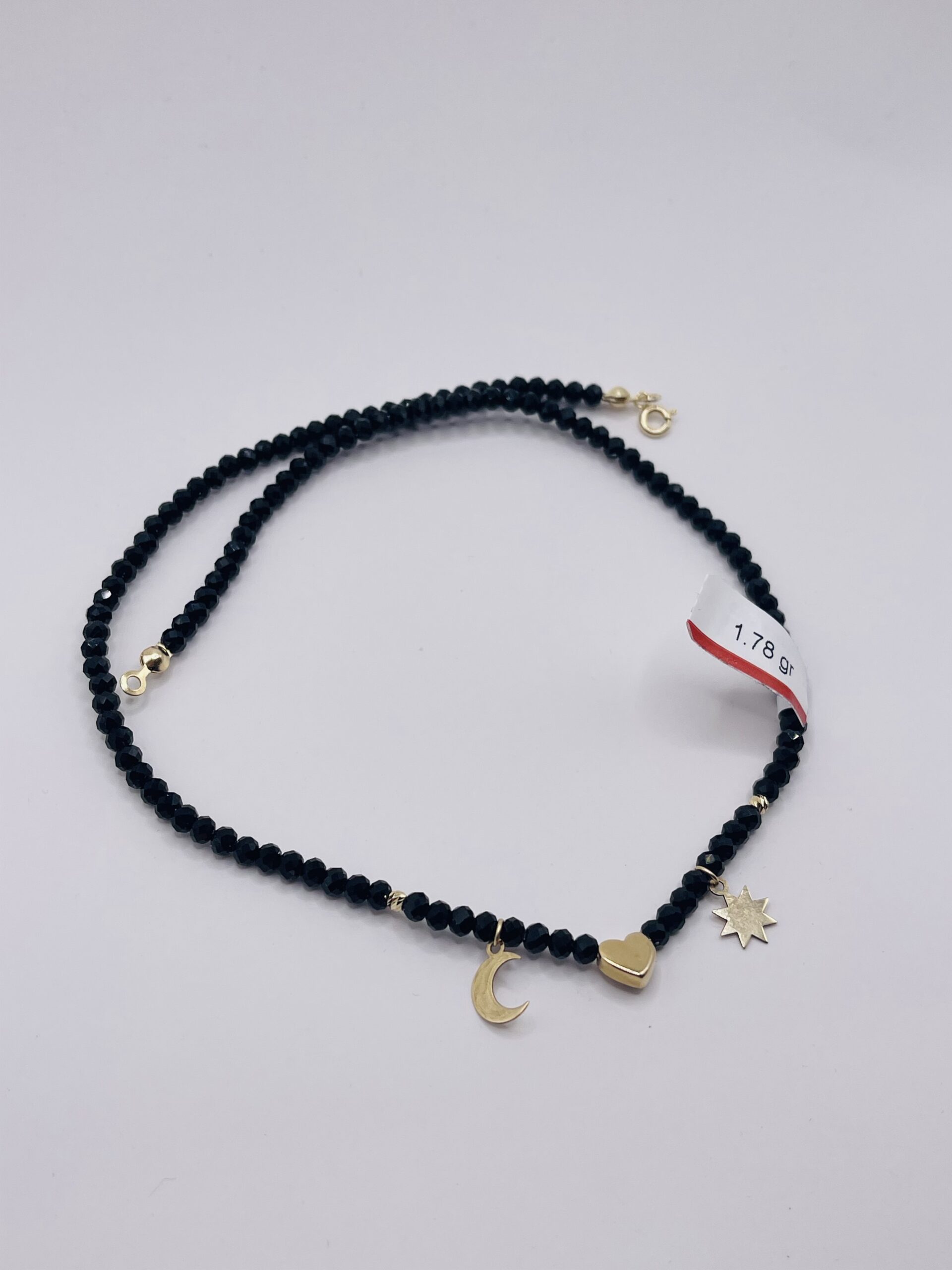 Elegant necklace made with black beads strung on durable nylon cord, featuring 14k (585) gold moon, heart and star charms, finished with a 14k (585) gold clasp.
