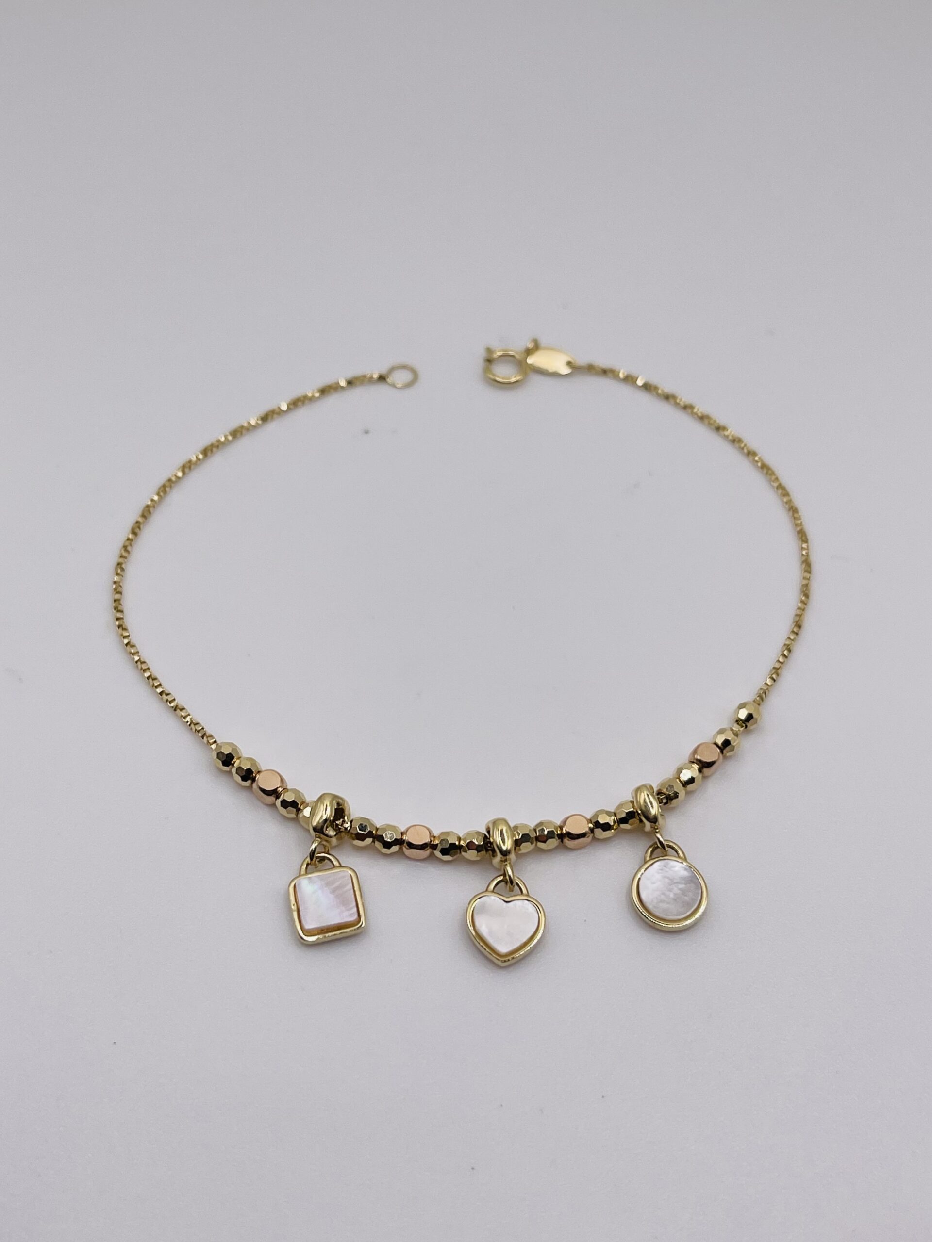 Elegant 14k (585)gold bracelet featuring delicate bead details and three beautiful charms : square, heart and round decorated with mother of pearl.
