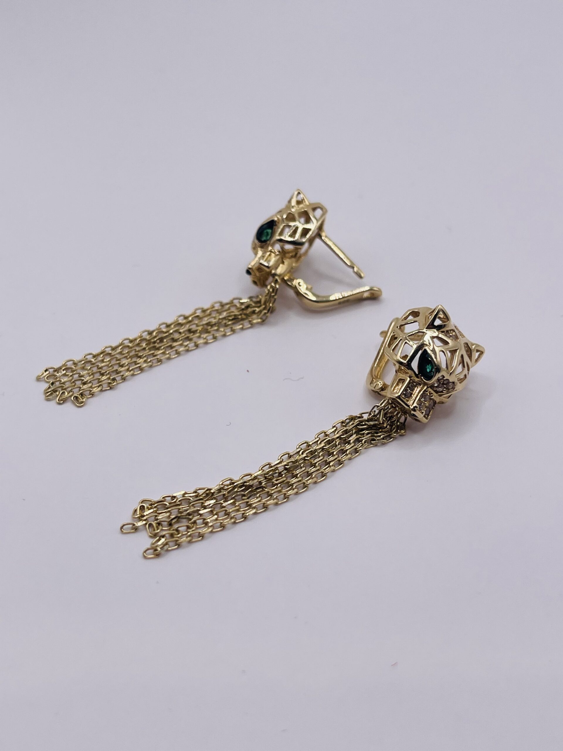 Statement 14K (585) gold earrings featuring a detailed panther design with elegant chain tassels and green zircon eyes. A bold and luxurious piece, perfect for standout looks.